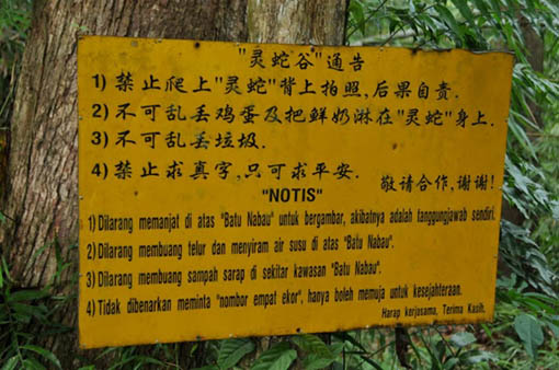 自从该巨蛇灵石“皈依”佛教神话传出,有心人竖起了告示牌,只可以祈求平安,禁止求财族再向“灵蛇”求财,
