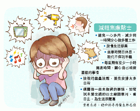 患者亦要避开敏感的声音或在室内使用电子隔音器,亦可播放自己喜欢的音乐、收听电子书,甚至静观,都可提升个人专注力,减少受声音影响。郑亦建议可进行声音联想法,告诉自己这些噪音不会带来伤害,然后想像为其他东西如卡通人物、科幻片主角发出的声音,将事件正面化。他提醒市民若对声音特别敏感,同时有以下症状,包括持续失眠并影响生活如翌日返工无精神、容易焦虑、变得暴躁、呼吸困难、头晕、心慌慌、腹泻或便秘等,都可能是患上焦虑症,应尽快求医。