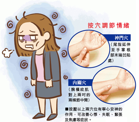 按压穴位对调节病人情绪及改善心悸都有帮助,例如手腕的“神门穴”、前臂的“内关穴”等,可用拇指指腹,以打圈、或向上向下按的形式,进行约2至3分钟按压,至有酸胀的感觉即可。按压上述两个穴位,有宁心安神的作用,并可改善甲亢相关症状如心悸、失眠、紧张及焦虑等。按压脚背的“太冲穴”、小腿内侧的“三阴交穴”及膝部附近的“足三里穴”,可滋阴补肾、疏肝理气,改善多汗、失眠及手震等情况。