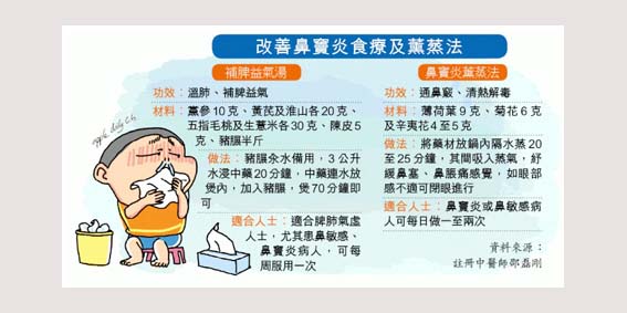 邵推介脾肺气虚人士,尤其患有鼻敏感或鼻窦炎煲“补脾益气汤”饮用,有助温肺、补脾益气。鼻窦炎或鼻敏感病人可采用中药薰蒸法,快捷纾缓鼻塞、鼻胀痛等问题,将薄荷叶、菊花及辛夷花放入锅内,隔水蒸约20至25分钟,期间吸入蒸气,可让鼻子即时感到通爽、舒适及温暖。这些中药均有通鼻窍、清热解毒功效,病人可每日进行一至两次。吸蒸气时,如眼睛感不适,可闭起双眼进行。