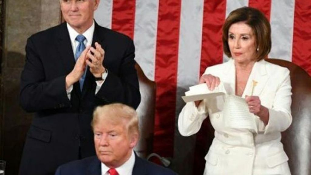 特朗普在弹劾案阴霾下发表国情咨文,与弹劾案推手之一众议院议长佩洛西有不少火花。佩洛西在特朗普进场时主动伸手希望握手,不过特朗普不知是故意抑或没注意到,转过身去没有跟她握手;而在特朗普发表完国情咨文后,坐在他身后的佩洛西逐少逐少地撕毁国情咨文文本版,成为传媒焦点。