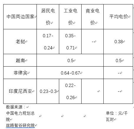 其一,中国电价比不少东南亚国家的电价低。我们经过公开数据发现,以2017年为例,中国各类型发电成本分别为:火电约0.37元/千瓦时;水电约0.26元/千瓦时;风电约0.56元/千瓦时;核电约0.4元/千瓦时。综合中国各发电类型占比,中国发电平均成本约为0.38元/千瓦时。考虑到中国出口电力类型主要为火电、水电,其中火电与水电比例约为3:1的因素,我们通过以下公式: 中国售电成本 = 中国国内发电平均上网电价 * 网损折算系数。其中中国国内发电平均上网电价0.376元/千瓦时,网损折算系数 = 1.0672(2017年中国平均网损损耗约6.72%)。因此,可通过公式预测出中国电量出口成本约为0.401元人民币/千瓦时。而当前部分东南亚国家的电费相对比较高(具体如图)。
