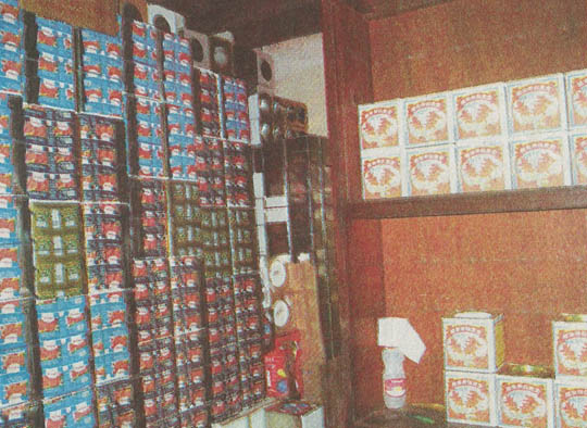 不仅招牌是“古董”级,店面布置也朴实无华,右前方用三夹板围了间小办公室,左边店面堆积了一包包茶粉,中间只留下狭窄的通道,办公室的背后,竖起了木架,叠放着大大小小已贴上茶庄商标招贴纸的锌制空珍。