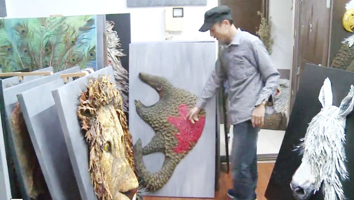 目前周建桥已创作了40多幅野生动物和以生态环境为主题的作品。在他家里除了堆满的作品外,还有一些关于野生动物的新闻展板和新闻笔记,周建桥表示,希望通过文化创意的方式重新创作新闻,让人们更加直观的看到这些野生动物的美丽和脆弱,从而唤醒人们的环保意识。
