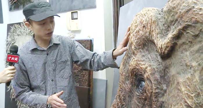 “为了体现大象皮肤的皱纹比较真实一些,我把这个报纸(用水)泡三天,泡三天之后它表面就会更加柔软一些,去搓的时候(就能呈现出)皱巴巴的(效果),泡完三天之后,用手把这里面的水拧干,拧干之后在刷一层胶,一层层的把这个皮肤一褶一褶把它捏成这个效果出来。”