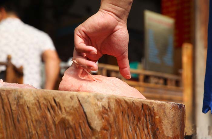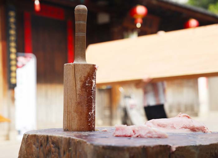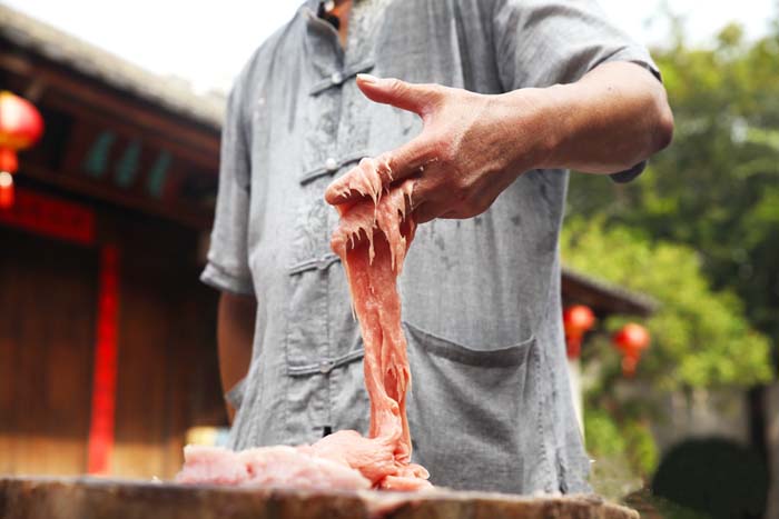 “同样是福建小吃,扁肉是‘面包肉’,而肉燕则是‘肉包肉’”,陈君凡一边捶打着肉块一边解释。