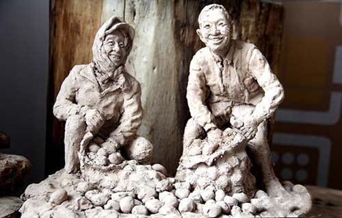 业余时间坚守泥塑创作18个春秋,赵铁军的泥塑作品逐渐形成了自己的风格,注重人物面部的特点、细节雕琢和衣服装束。赵铁军创作捏制的《年轮》《收洋芋》《伙伴》《掐草编》等作品,充满乡土气息,表现出生产、生活场景,勾起了观看者浓浓的乡愁。