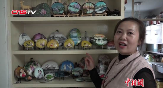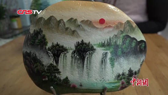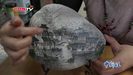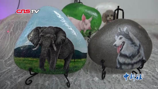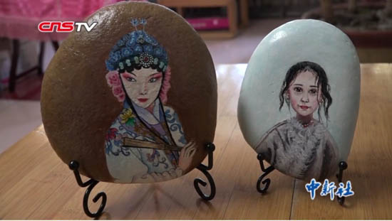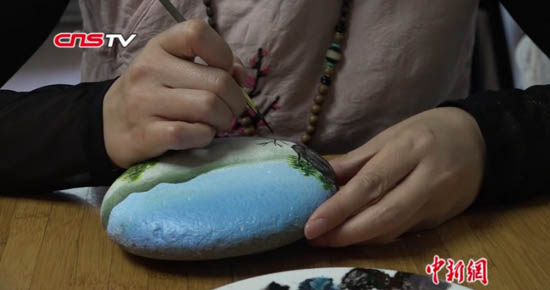 王海燕说:“石头都是很小的,要把一个几十厘米的画,画在一个十几厘米的小石头上,这样的话它就需要特别的细致,它的线条包括用色,这应该是很困难的。”