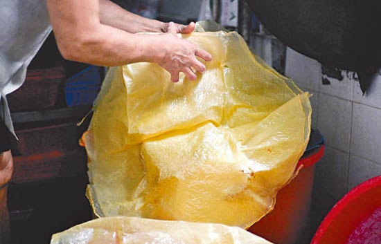 能够吃得一碗美味好粥,备尝艰辛的煮粥师傅居功厥伟。谁知,粥底软绵的秘密在于长时间煲煮,并加入树记腐竹,粥底特别绵香,不像坊间以麦皮取代,粥底容易化水,还加入大地鱼、江瑶柱以作提香之效。何生直言:“煲粥时间漫长,师傅都在深夜才回来煲粥,至于辛不辛苦?其实,所有饮食业都是这样,没办法。”煮粥老师傅指着一支长长的竹杆,杆上有若干刻度,愈高的刻度表示愈多桶水,并解释:“这个是量度尺,用来校水煲粥,最多可以煲到七桶。今时今日大概煲三至四桶,等到水滚再下米,首先浸干瑶柱,浸好之后再搓烂它,之后就放进粥里面用来煲粥底。然后,好好清洁干净地宝鱼,用袋包裹好,吊在煲侧边。鲜竹浸一浸之后要啤水,加下去煲粥里面,可以令到粥底更加软滑。需要好多时间去煲,要整几个钟头。配好材料之后就要去洗米,再倒入优质皇冠油,通常这个时候水就滚,时间刚刚好,再加入米和腐皮,一直搅不好黐底,现在就要等粥底变得绵滑,每隔一段时间就要搅它,当粥底开始绵滑就会变得容易黐底,大概要一个钟头零四个字。”语毕,他便步出厨房,喝口浓茶。