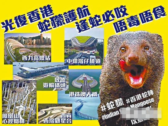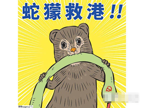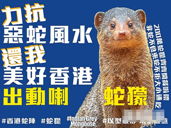 相传,香港被布了“毒蛇阵”,不断以蛇形建筑物吸乾香港灵气。有高人在网上指点,要破解这些风水阵,就要“以形破形、以意破意”,以蛇的天敌“蛇獴”图像冲散毒蛇能量。所以继pepe、连登猪之后,“蛇獴”渐渐变成新一代“护港神兽”,越来越多人画蛇獴公仔到处贴,甚至转做facebook头像或者手机屏幕。但其实不但有虚拟的獴,香港是有真正的野生獴。