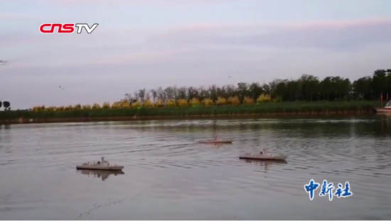 潜艇、巡洋舰、驱逐舰、护卫舰行驶在水面上,队伍整齐,带起浪花,这场舰船“表演”,其实这只是几位老人自制的舰船模型。
