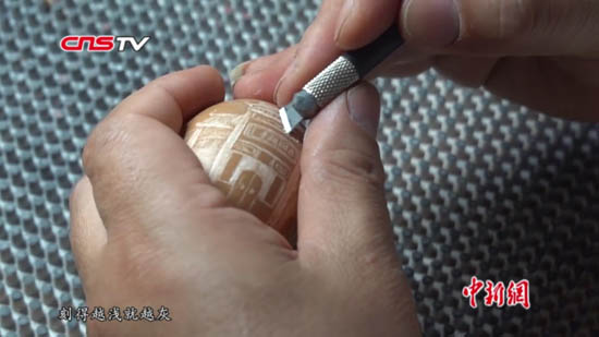 苏鹏说:“蛋雕这一块,难点主要是在技巧方面,稍微力度用大的话,在这个0.3毫米的蛋壳中雕刻,一不小心就碎了,所以雕刻的力度要掌握得很均匀,不能重不能轻,就是按照它的力度慢慢地刻下去。”