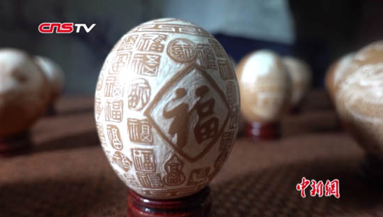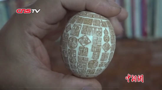 湖南女婿自学蛋雕技艺十年 蛋壳上刻百字福