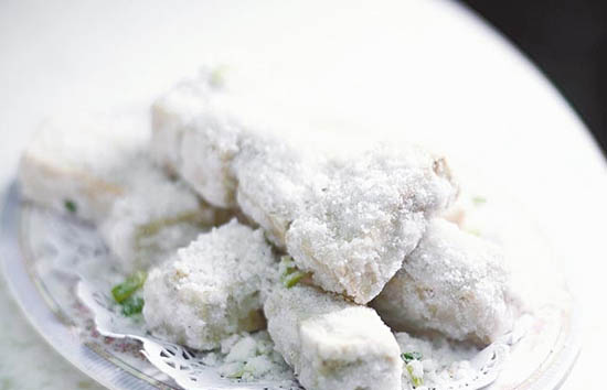 反沙芋亦是另一道不容错过的滋味菜式,这是潮汕地区传统甜点,外脆内粉,坤哥解释:“煮糖胶,是整个反沙芋最主要,同时是最难的部份,见糖水滚起那时,动作开始由慢转快。如果火候适当,翻拌到无水分时,糖胶会慢慢转白色,但这个过程不可以停,镬铲都要越来越贴住镬底。当整个镬里面全部都起白泡,就把早前炸好的芋头、芝麻和葱油倒进去。见到芋条开始凝固,继续翻拌,就会慢慢干身,所有糖浆已经黏在芋头外面,之后给时间芋头摊冷。”