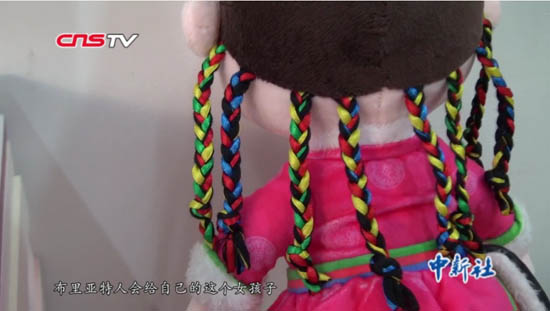 赛努穿着布里亚特人的女孩的典型服饰,帽子有一串的五彩宝石,布里亚特人会给自己的女儿梳上8根小辫儿,而且8根小辫儿里会编上彩色丝带,特别有特色,特别美丽。