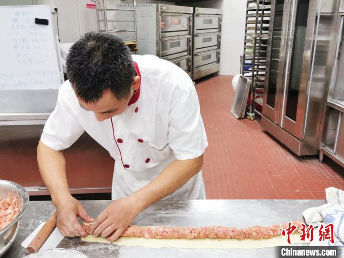“传统鸡仔饼的外观不规则,仅需将用面粉、糖、糖胶和水调配好的粉皮切块麪茄詜五个手指宽的长条状,把冰肉(焯水后用酒和白糖腌制好的肥猪肉)、砂糖、洋葱、生姜、蒜头、南乳、盐、五香粉、胡椒粉、沙姜粉、油、酒、水、面粉、麦芽糖、花生、芝麻等按比例拌匀的馅料放到麪莕的粉皮上,采用粉皮两边包裹馅料的方式,将馅料卷成长条圆柱状后,按饼的大小切出小剂子,翻过来馅心朝上,用掌心轻压成饼状。”广东厨艺技工学校面点教研组长兼粤菜师傅工程面点指导教师梅昔明介绍,有的师傅选用核桃仁、榄仁、瓜子仁等做馅料,做好的鸡仔饼抹上蛋液就可入炉烘焙,20分钟后就可出炉。