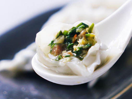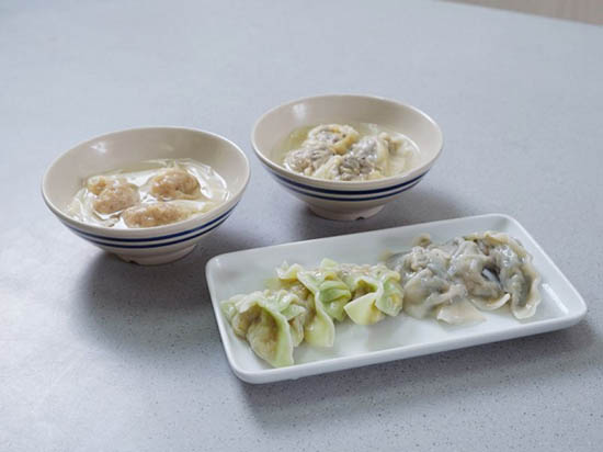 “我每天早上6时便到禾輋街市,先买新鲜猪肉,再看看当日有甚么新鲜蔬菜,8点多回到铺头,开始洗菜切菜,捞馅包饺子,包几多卖几多,不会补货。”李小姐说。饺子款式多,坚持用新鲜前胛猪肉,七分瘦三分肥。“前阵子,猪肉贵得不得了,我也没有用冰鲜,赚少一点,也得要真材实料。”猪肉够鲜,只加盐和生抽调味,为了吃来惹味一点,又混入自家爆香过的冬菇、姜、葱和蒜茸。接着,再配搭当日入手的新鲜蔬菜,“有莲藕、粟米、芹菜等,通常做到闷就会转款,有时见到老街坊开口想食甚么我又会包,不定的。”不过,招牌韭菜(15元港币/半打)一定必备。“我只选那些细叶的,有机农家菜,比较嫩,比较香,不像大叶的起渣又没有味道。”看李小姐包饺子云吞,就觉得像妈妈一样,菜、肉比例差不多一半半,很足料,吃来菜爽肉甜够多汁;云吞,又只只有鲜虾,吃来扎实鲜甜。