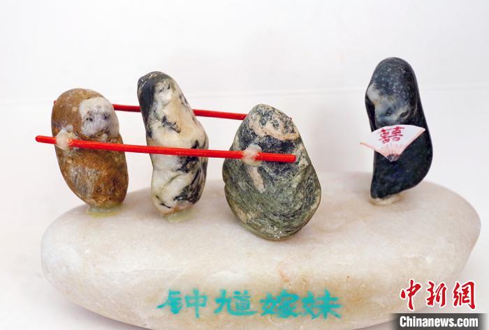 指着“钟馗嫁妹”,张裕福介绍说:“小品选材是数年的积累,石形石貌,色彩搭配,道具使用,都尽力做到最好。这是一组用黄河石表现戏剧题材的小品佳作,很有观赏性。”