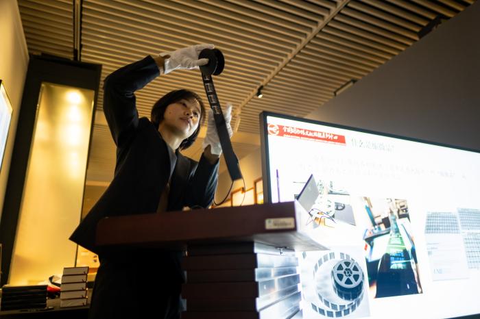 “这样缠成一卷一卷的合格胶片就是‘母片’,黑底白字。”摄制与技术服务组组长樊亚宁展示了一卷胶片,“母片有两种规格,一种是35毫米,一般拍摄善本和报纸;一种是16毫米,一般用来拍图书、期刊等。”