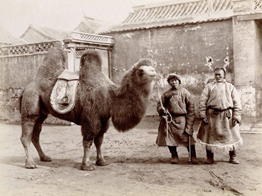 两个身穿毛皮斗篷的男子并肩而立,他们岔开双脚,其中一人牵着一只壮实的双峰驼。人和骆驼都直视镜头。跨越时空,你和他们目光交集。