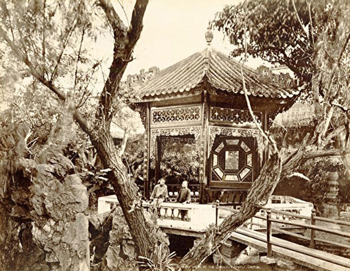来自广州雅真照相馆(A Chan,或Ya Zhen)的一帧照片中,两名男子正在一座四角凉亭前聊天。一座窄窄的小桥通向四面通透的凉亭,建筑与周边的树木完美融合,给人宁谧安祥的感受。照片构图精美,保存状况甚佳。图像细节非常清晰,而更值得称道的还是其艺术价值。