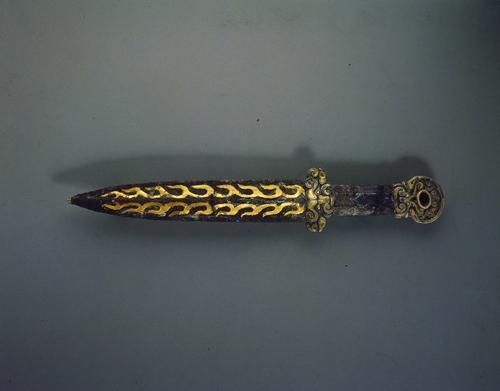 比如一柄“错金铁短剑”,剑身两侧有金片花纹带,一面作火焰纹,另一面为连续的勾喙兽首纹。环首和格由银合金制作,环首镂空钿嵌金片饰有卷云纹。这足以说明西汉工匠们惊人的创造力。