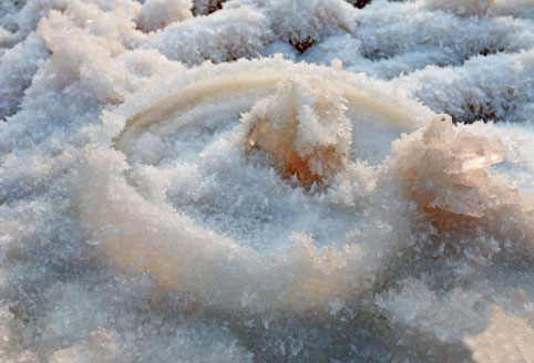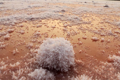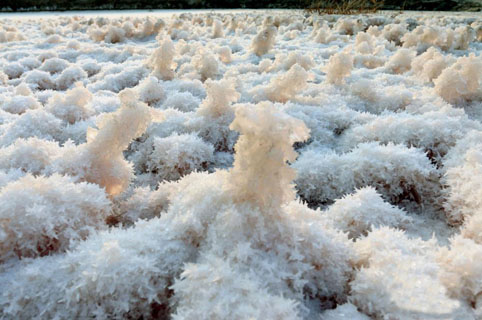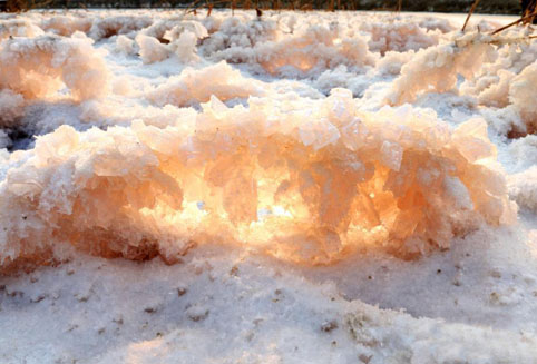 山西运城盐湖绽放美丽“硝花” 03 01, 2019 登载于 中国万象 近日,山西运城千年盐湖在低温作用下湖面上绽放的“硝花”。“硝花”又叫“硝淞”。 连日持续的严寒,使山西运城盐湖的湖面上,大面积绽放出形状奇特的“硝花”美景。据悉,“硝花”是芒硝结晶在盐板上的一种特有的物理现象,只有当气温低于零下5摄氏度时,硫酸镁便会从粉红色卤水里结晶而出形状多样的“硝花”。