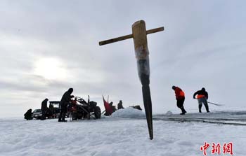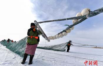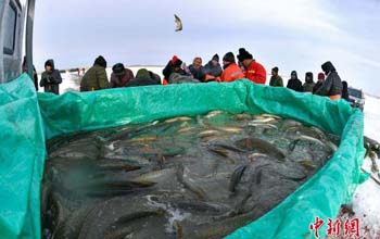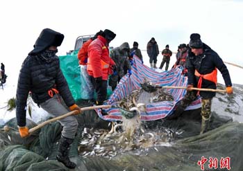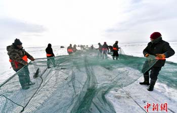 新疆乌伦古湖冬季冰上大拉网捕鱼启幕 05 01, 2019 登载于 中国万象 新疆福海县乌伦古湖已是千里冰封,当地渔民于1月4日冒着零下20℃以下的低温,利用工具凿冰眼、下网、穿杆、走线,将千米大网布置于冰面之下,当天的冰上大拉网共捕获各种鱼类3吨左右。 冬季冰上大拉网捕鱼是乌伦古湖的传统捕鱼方式,这种场景在中国仅现于东北查干湖和福海乌伦古湖,场面壮观,极具观赏性。捕捞期为每年12月中下旬至次年3月初。 更多相关: « 中国邮政发行《己亥年》特种邮票 寒冬探访冰面上工作的“采冰人” »