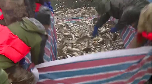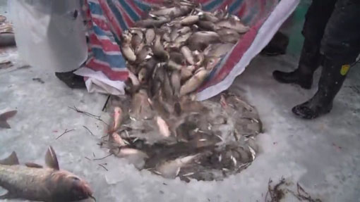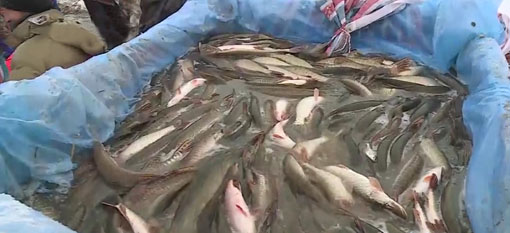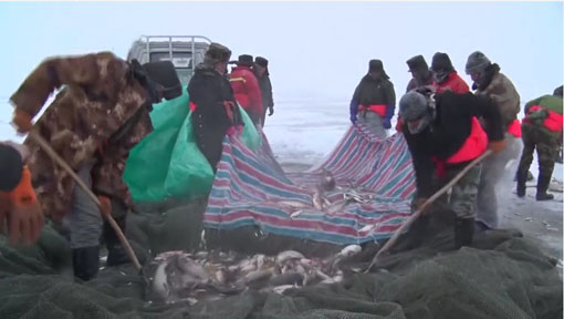新疆阿勒泰福海县乌伦古湖冬季捕捞队鱼把头张海江说:“从我们渔一代(第一代渔民)传承下来,我们当地人叫纳福放生,只有把鱼保护起来,使我们的产量更高,使我们的渔民收入也更加好了。”