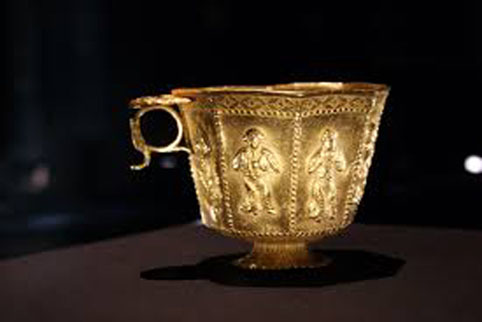 这件中亚伎乐纹八棱金杯,高10厘米,呈八边形,杯面上有乐师和胡人跳舞的形象,杯把和指垫上同样有卷发的胡人头像,该金杯的形制与1970年西安何家村唐代窖藏出土的高6.4厘米的伎乐纹八棱金杯类似,无论造型还是装饰风格都充满浓郁的西域风情。