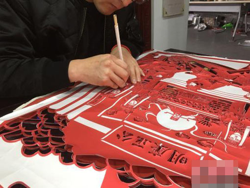 在金俊安的工作室里,只见他手捏红纸,或雕刻、或裁剪,一个个人物和建筑,立马在薄纸上呈现出来。