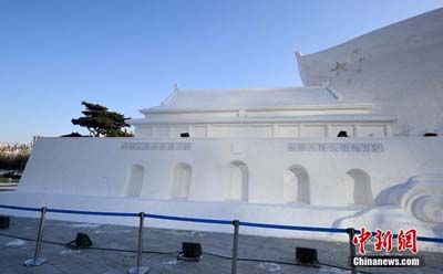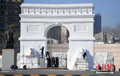 长春打造多座“巨无霸”雪雕 造型百变巧夺天工 10 01, 2019 登载于 中国万象 长春世界雕塑公园今冬打造的巨型雪雕群近日已全部竣工。天安门、长城、京韵等巨型雪雕造型宏大,细节丰富,远观近看,艺术性十足。 图示:一座名为《荣耀中华》的雪雕融入了天安门、复兴号等因素,以此纪念改革开放四十年。 图示:雪雕版的“凯旋门”长18米、宽9米、高16.5米,别致的造型吸引众多市民前来观看。 图示:雪雕版的长城,十分宏伟。 图示:一座名为《荣耀中华》的雪雕融入了天安门、华表、五星红旗、高铁车等元素,以此来纪念改革开放四十年。 更多相关: « 甘肃一泥塑艺术师 历时十多年洞中塑成八百佛像 内蒙古赤峰冬季跑马吸引众多游客 »