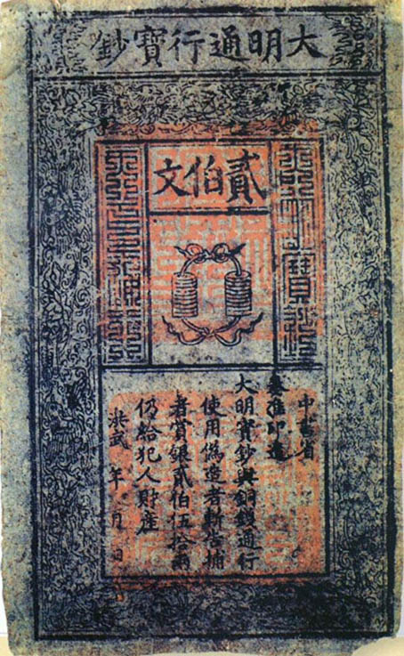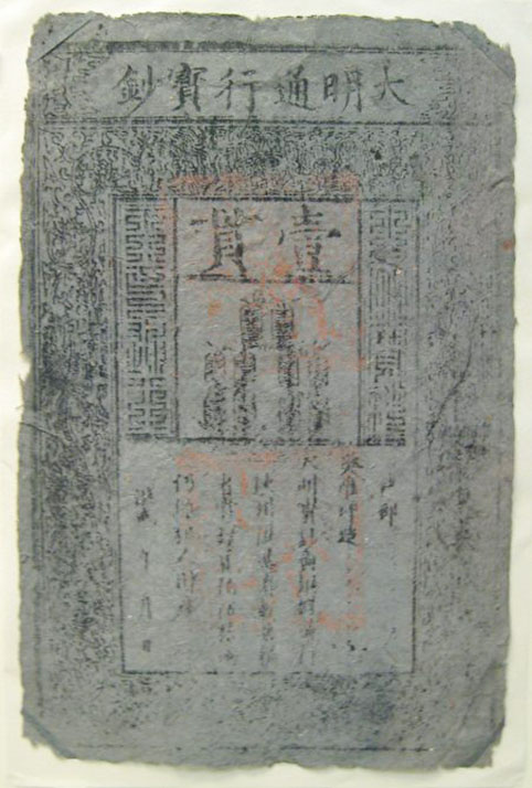 至大明时期,在纸钞防伪方面,技术含量又增添不少。洪武八年三月,朱元璋借鉴元朝的纸币制度,下令设立宝钞提举司,管辖钞纸、印钞二局和宝钞、行用二库。洪武九年印制“大明通行宝钞”。