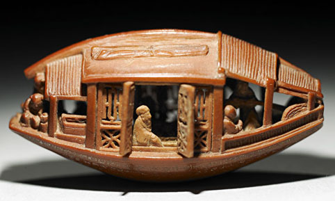 明朝纸币上出现一项绝巧的工艺──微雕。微雕技师一般多精通绘画、书法、雕刻等艺术。图为清 乾隆二年 陈祖章 雕橄榄核舟(底刻“后赤壁赋”全文)。(公有领域)