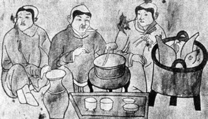 “涮火锅”何时出现的?至迟在公元10世纪时的辽代已有了。目前可以看到最早的涮火锅场景,就是在辽代契丹人的壁画中发现的。1984年,在对内蒙古自治区昭乌达盟敖汉旗康营子一座辽墓考古发掘中,在甬道东西两壁上均发现了壁画。其中一幅壁画中,三个人围着一个三足火锅,席地而坐,中间一个人正在调拨着火锅,火锅旁边一只三足容器内盛着满满的肉等已清洗干净的待用食材,桌上还有两只盛放佐料的小碗……一千多年前契丹人涮火锅的场景栩栩如生。