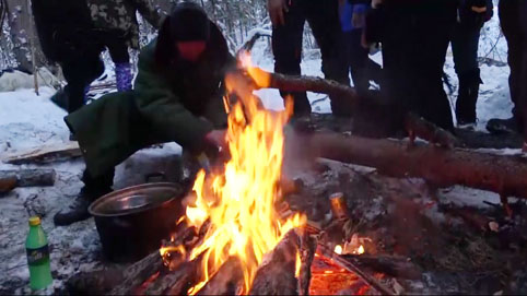 古老毛皮滑雪板穿越队队长玛力琴说:“这一次我们9个小伙子一路上,人也没有,啥也没有,我们吃的喝的还有穿的东西,我自己拖上去的。后面树林多,路不好的,有点困难,最难的时候走27公里一天。晚上就是在外面架火,架火还有自己火的旁边住。”