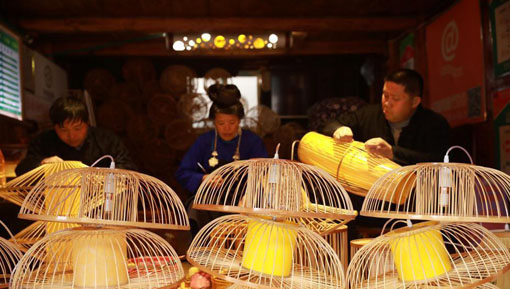 贵州丹寨民众赶制特色“鸟笼”灯笼迎新春 19 01, 2019 登载于 中国万象 图示:非遗传承人王玉和(右)制作“鸟笼”工艺灯具。 春节临近,在贵州省黔东南苗族侗族自治州丹寨县“鸟笼制作专业村”卡拉村,“鸟笼”装饰灯笼制作手工坊迎来了节前销售旺季,村民们加班加点制作用传统竹编鸟笼改装的特色“鸟笼形”节庆灯笼供应春节市场。 据悉,卡拉村的“传统鸟笼制作技艺”于2008年被列入贵州省第二批非物质文化遗产名录。 更多相关: « 香港故事:年味盆菜的“变”与“不变” 探访陕西历史博物馆的“透明”文物修复室 »