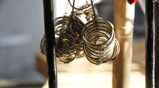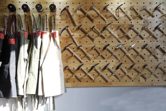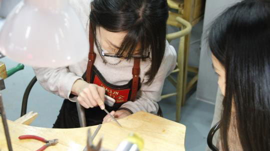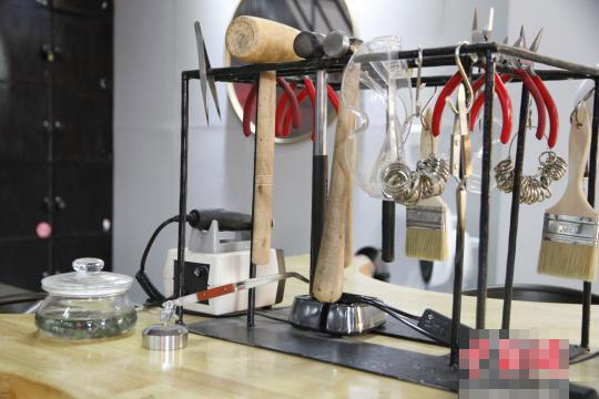 在刘彦鑫的工作室里,两张大木桌共8个工作台,工作台前端呈凹进去的弧状,一根带三角缺口的木棍从圆弧中心伸出,工作台的架子上挂满了金工锤、錾子、护目镜等打金器具。“打制首饰需要力量,木棍可以提供一些支持力,让打金者更容易上手。”刘彦鑫说。