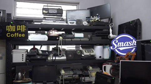 走进店面,首先映入眼帘的是货架上各式各样的“旧家具”,从电扇、玩具车,到座机电话、电视机,再到电脑显示屏、电饭煲、收音机,应有尽有。店长介绍,这些都是用来发泄的物品。一旁的装备架上,有保护头盔、连体防护服、橡胶靴、棒球棍等道具供选用。墙上贴着体验价目表,一人的套餐体验价格在200元(人民币,下同)左右。