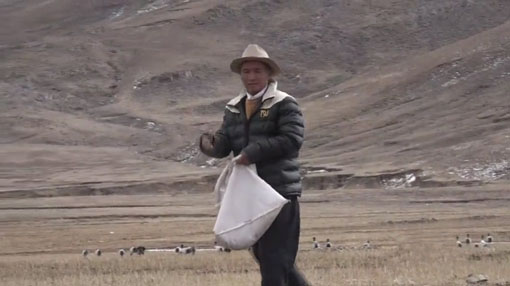 旦增对黑颈鹤的习性、爱吃的食物都十分熟悉。因为黑颈鹤爱吃小麦,每到冬季,林周县林业局给每一位巡护员发放1000斤小麦,旦增每天下午五点钟准时到田里抛洒小麦,等待黑颈鹤的归来。旦增说,他每天大约要撒50斤左右的小麦,小麦不够喂了,还可以再申领。
