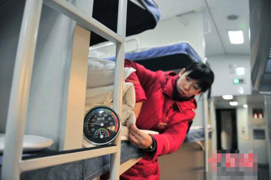 “按照规定,守车过程中工作人员严禁出库,这13个小时里,我需要进行每两小时一次的全列巡视。74个车门、180扇车窗的锁闭情况,暖气管、洁具柜、车门翻板等隐蔽部位,必须一一检查。这样才能保障旅客乘车安全,给旅客创造干净、安全的旅行环境。”工作间隙的高燕敏说道。