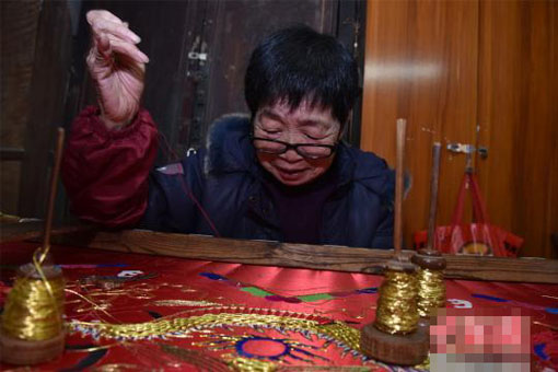 “金苍绣是以各色金丝线盘结成不同的图案,并将其钉在绸布底子上的刺绣针法。”陈美英介绍说,她从19岁就开始学金苍绣,50多年来一直坚持创作,如今她倍感肩上责任重大,冀望这一技艺后继有人。