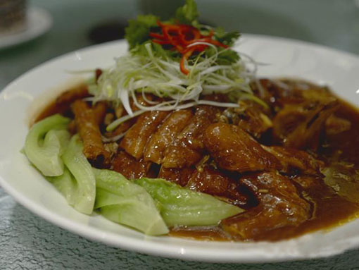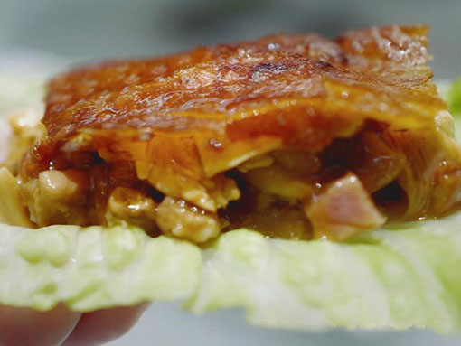 这一道“生财显贵鸡”散发着旧时代风味,酱汁中有几层的umami:咸香的、陈香的、咸香与陈香交错的;这几层的umami里头,还夹杂了陈皮、老姜、酒味……味道比起错综复杂的感情关系还要一言难尽,把鸡味衬映得摇曳多姿──酱汁是历经沧桑的陈馥传香,鸡肉却是鲜嫩可人;蚬的咸鲜、鸡肉的甜……在美食的世界里,一切变得有可能,根本就是奇缘式的相逢,火花奇特,好吃,且吃过不会忘记。为何会从式微到消失,想来年轻的一辈对于蚬蚧酱的味道可能都不太懂得欣赏吧?而且那酱汁的平衡拿捏不易,才不至于过咸过于浓重,令人想要对那引人入胜的层叠对立交错滋味追着来吃。稍微失手,都会沦为莫名其妙的难吃下品,连鸡也浪费了──相信这个部份,跟此菜的消失有点关系!难得邓浩宏师傅有心,在这老菜的基础上,自行创作了新时代版本“生财好事显贵脆皮鸡”:烧鸡拆肉,鸡肉和豚肉粒、豪豉、蚬蚧酱一起炒香作为佐料,吃的时候,生菜垫底,佐料置中间,面层铺上烧鸡皮,既像肉碎生菜包的豪华版,又像中式版的三文治。蚬蚧酱在里头只是一个点到即止的调味品,增添浓惹风味刺激食欲,跟传统版本的功能有所不同。据悉“新生财显贵鸡”颇受食客欢迎,有人追溯起创意始源方知道香港曾一度流行过这样一道年菜,也算是对饮食文化保育的一种贡献吧!