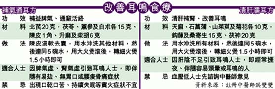 洪推介两个改善耳鸣食疗,其中脾气虚、肾气虚引致耳鸣人士,可服用“补气通耳方”,有补益脾气、通窍活络功效,材料包括北貼茯苓、党参等。肝阴不足的耳鸣人士可饮用“清肝濡耳方”,以清肝补肾、改善耳鸣,材料包括天麻、石菖蒲、山茱萸、钩藤等。病人若未能分辨体质,宜先谘询中医师意见。